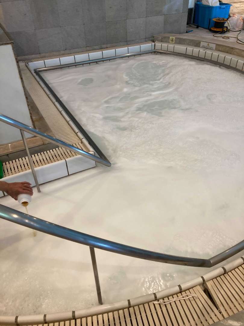 ろ過循環配管内部に付着したスライムの除去 過酸化水素による化学洗浄 定期的な作業を実施され、安全な施設運営をされております また、レジオネラ菌の検査も実施され、常に衛生的な状態を管理しております