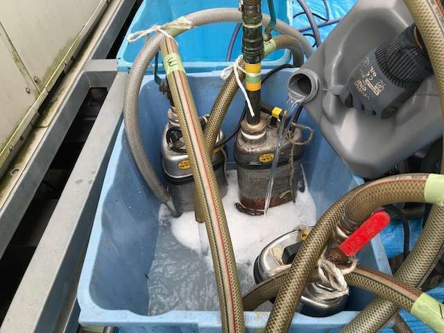 某現場では、約40台程度が連結されており、洗浄の為の仮設ラインを組み、指定の薬品を循環させました。